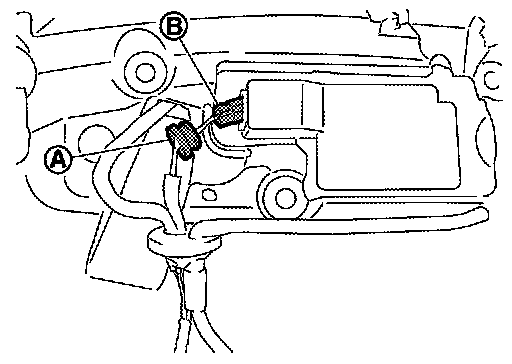 3.Remove harness grommet (A), and then disconnect harness connector (B).