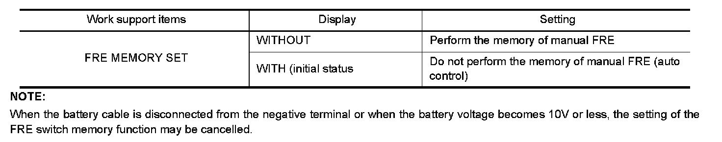 - If the ignition switch is turned to the OFF position while the FRE () switch is set to ON (fresh air intake), "Perform the memory" or "Do not perform the memory" of the FRE () switch ON (fresh air intake) condition can be selected.