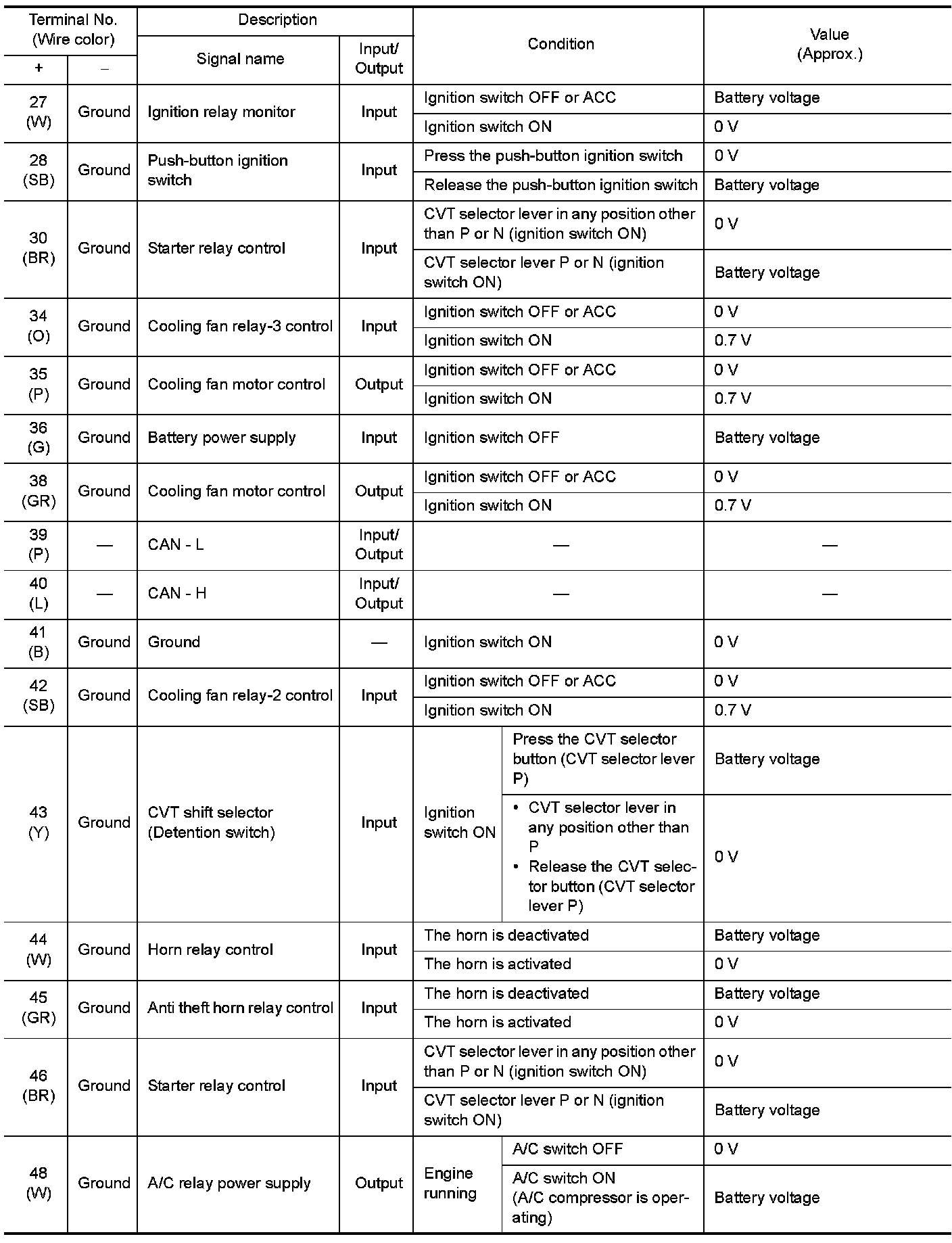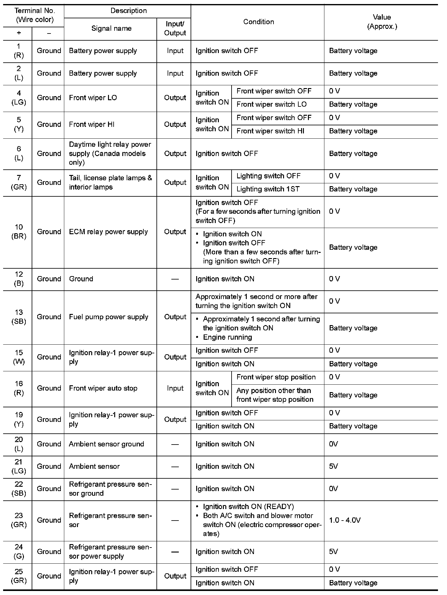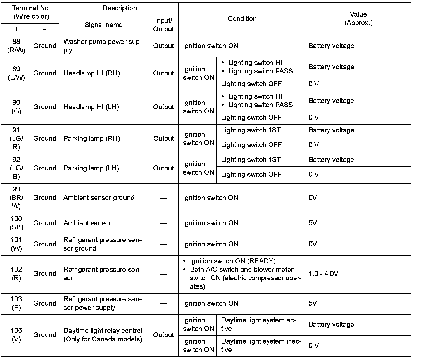 Pinout Values and Diagnostic Parameters