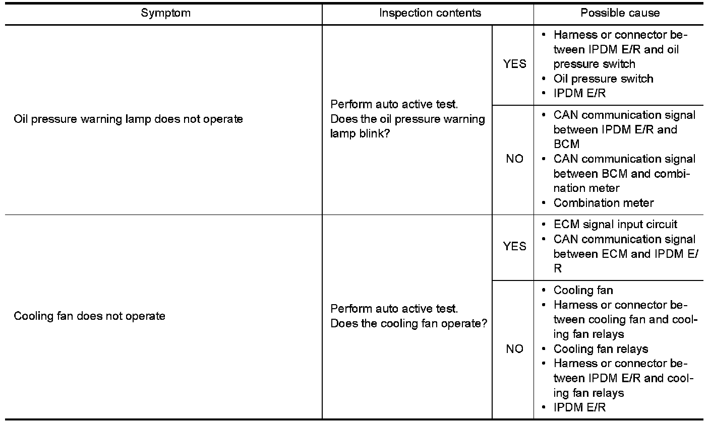 - IPDM E/R starts the auto active test with the door switch signals transmitted by BCM via CAN communication. Therefore, the CAN communication line between IPDM E/R and BCM is considered normal if the auto active test starts successfully.