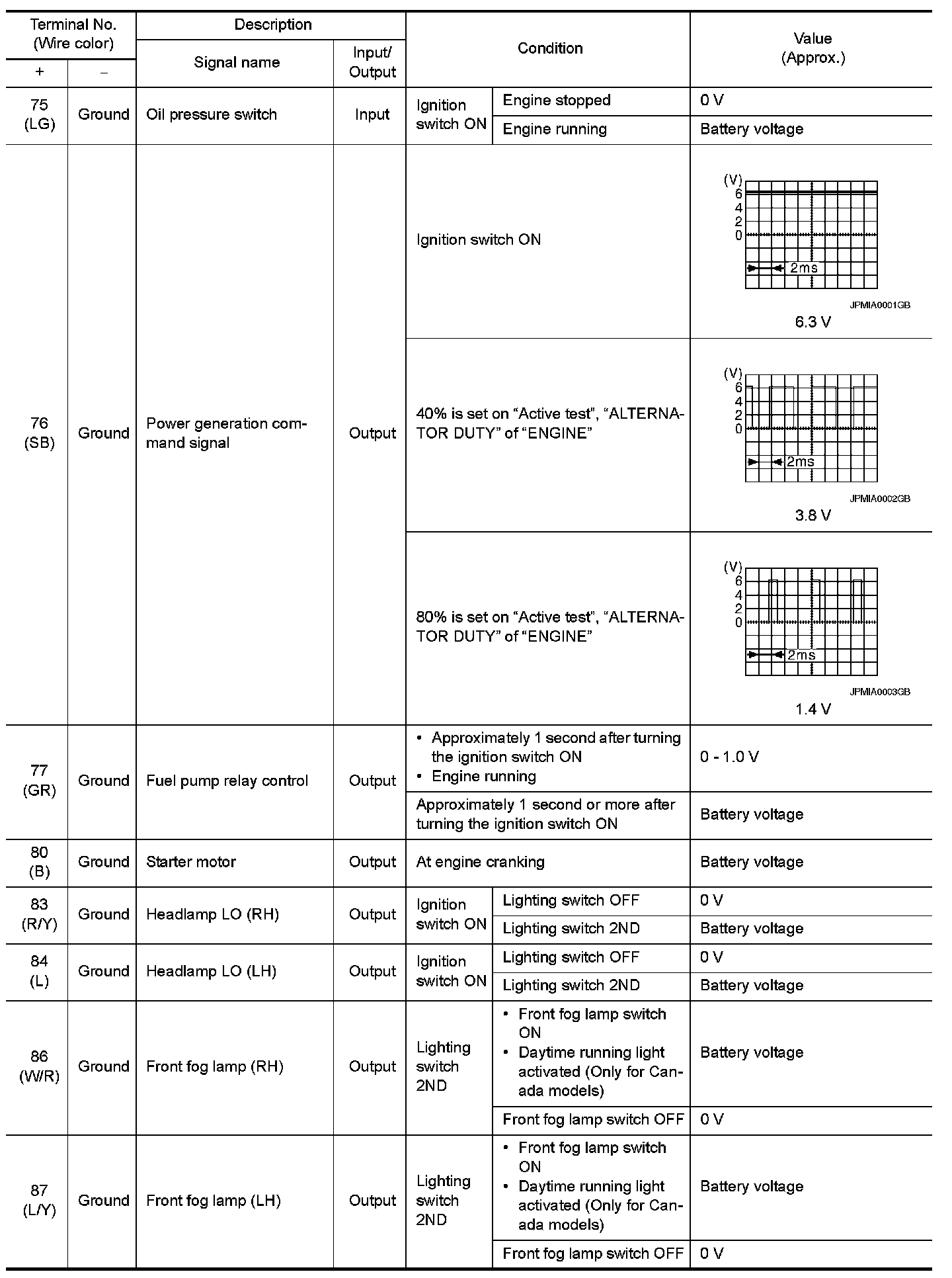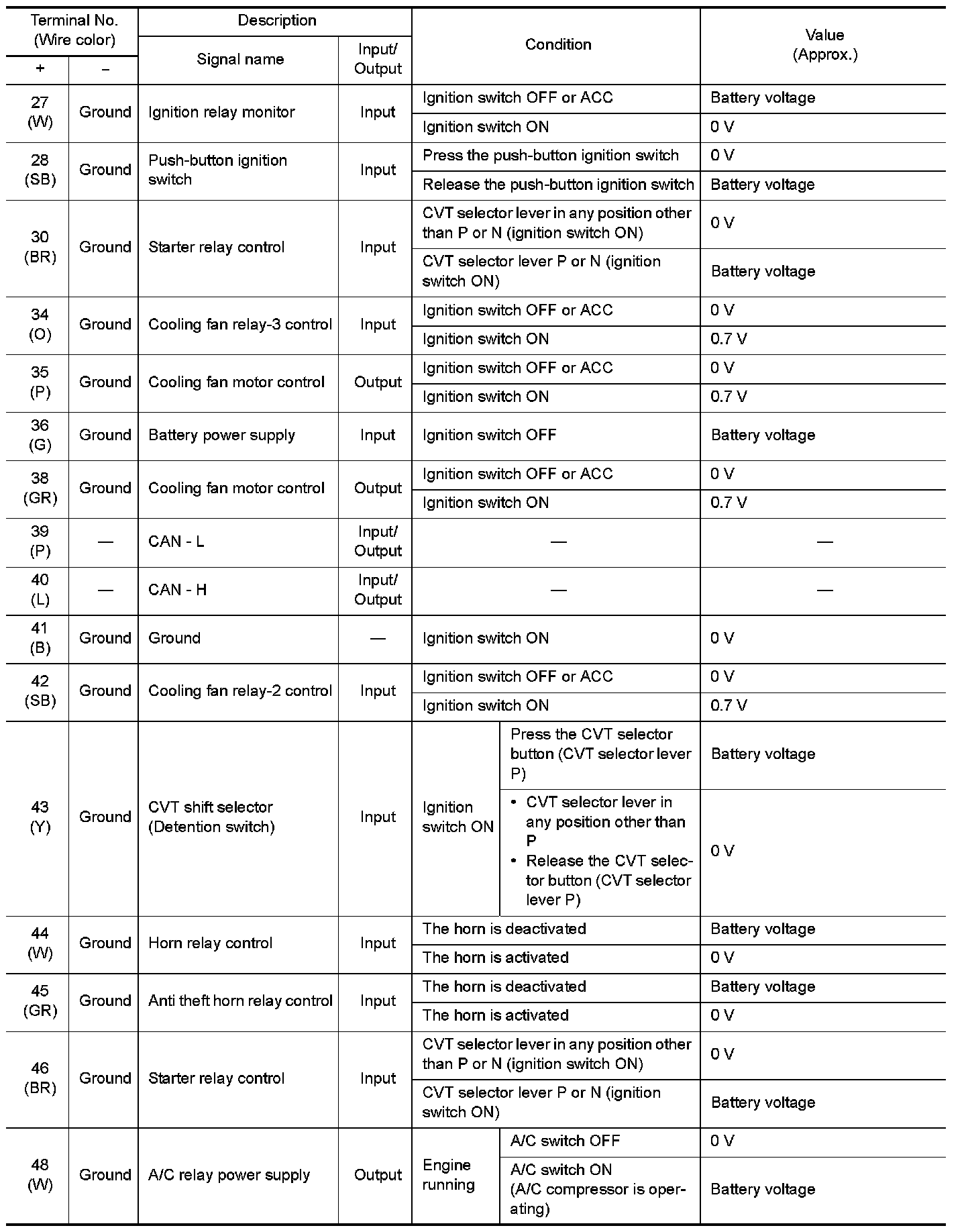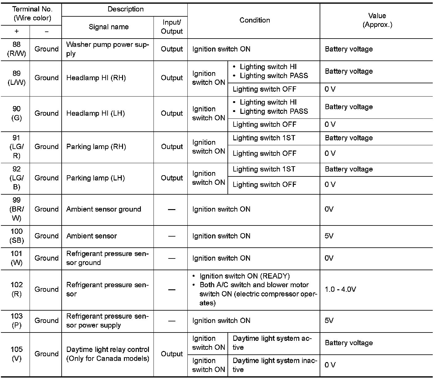 Pinout Values and Diagnostic Parameters