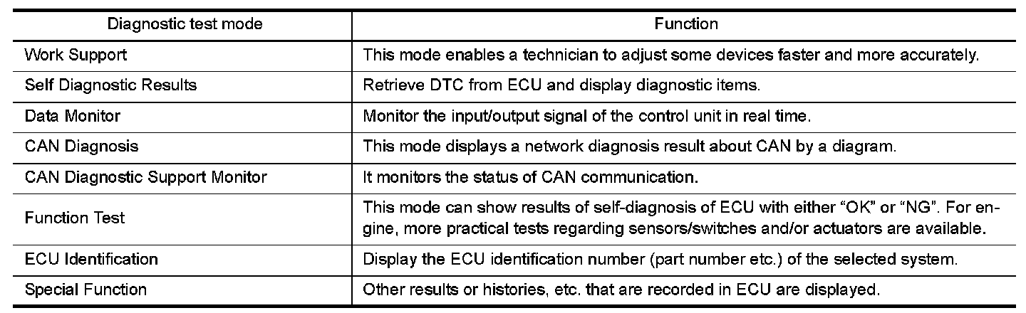 CONSULT can display each diagnostic item using the diagnostic test modes shown following.