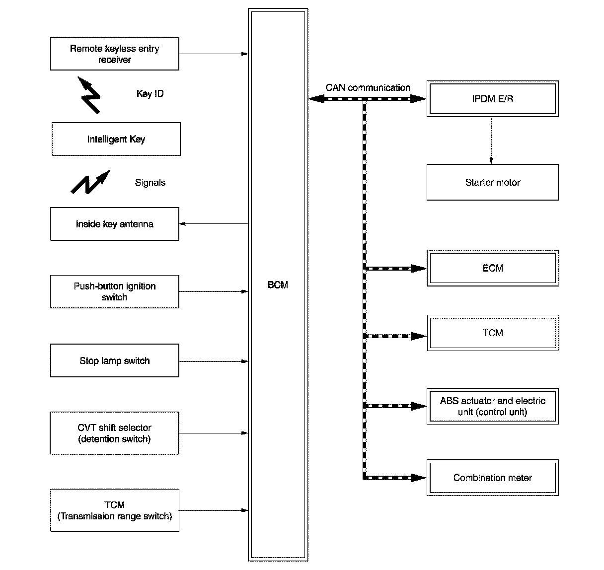 1.When the push-button ignition switch is pressed, the BCM activates the inside key antenna and transmits the request signal to the Intelligent Key.