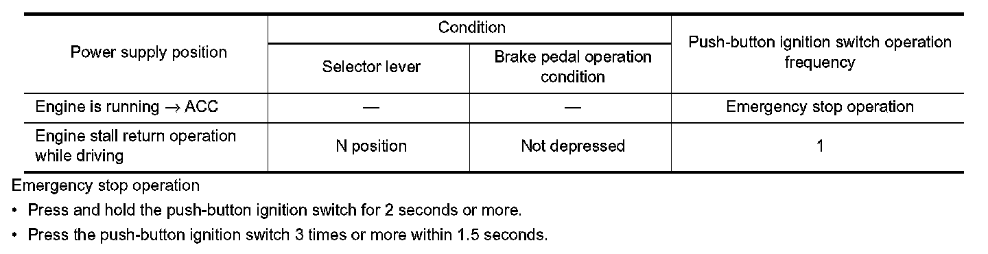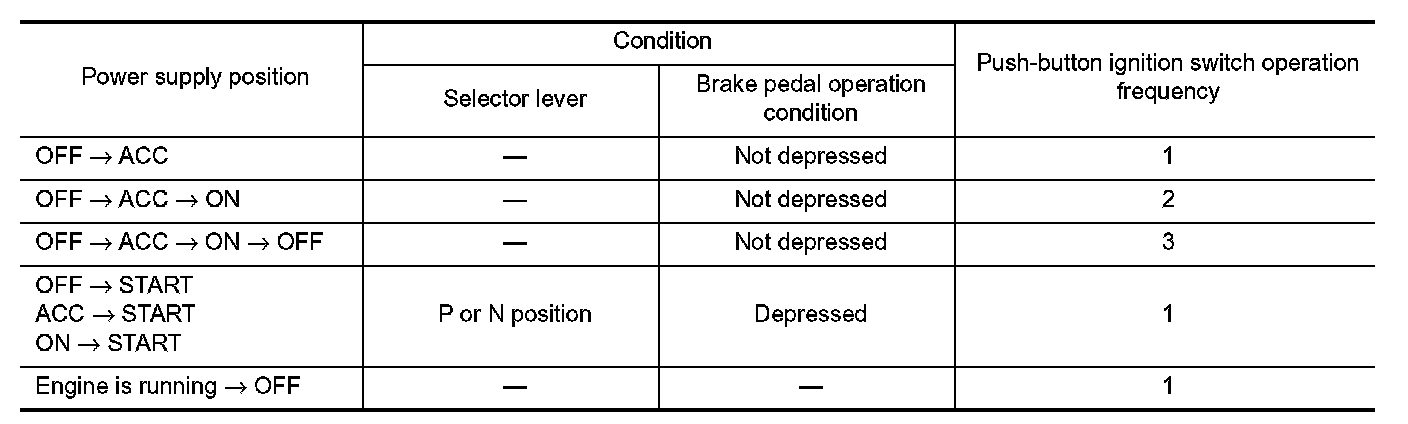 *: For the engine start condition, refer to "IGNITION SWITCH POSITION CHANGE TABLE BY PUSH-BUTTON IGNITION SWITCH OPERATION".