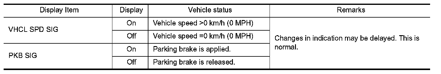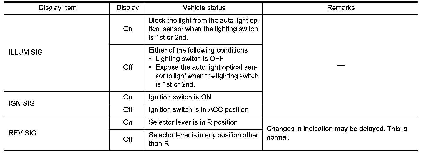 - Displays the status of the following vehicle signals inputted into the AV control unit.