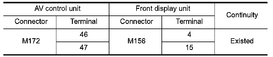 3.Check continuity between AV control unit harness connector and front display unit harness connector.