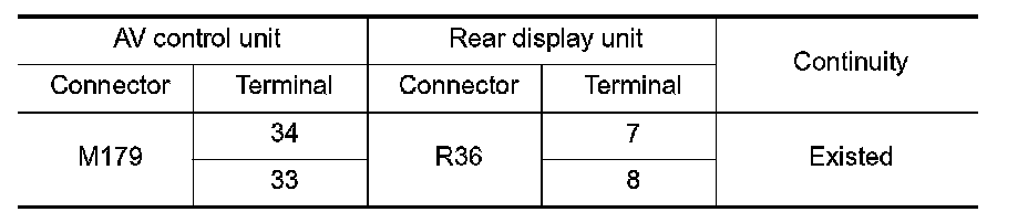 3.Check continuity between AV control unit harness connector and rear display unit harness connector.