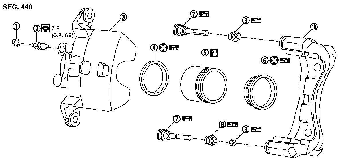 -THE LARGE ILLUSTRATIONS are exploded views (see the following) and contain tightening torques, lubrication points, section number of the PARTS CATALOG (e.g. SEC. 440) and other information necessary to perform repairs.