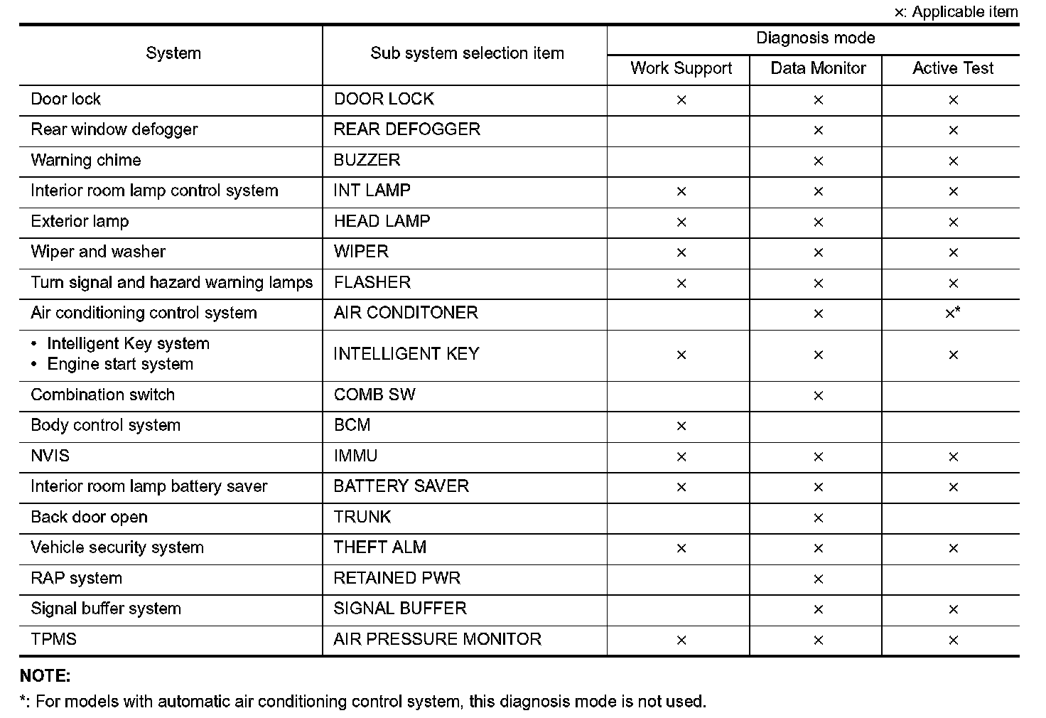 It can perform the diagnosis modes except the following for all sub system selection items.