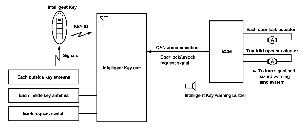 - If the key ID check result is OK, the Intelligent Key unit sends the door lock/unlock or trunk open request signal to BCM (Body control module) via CAN communication line.