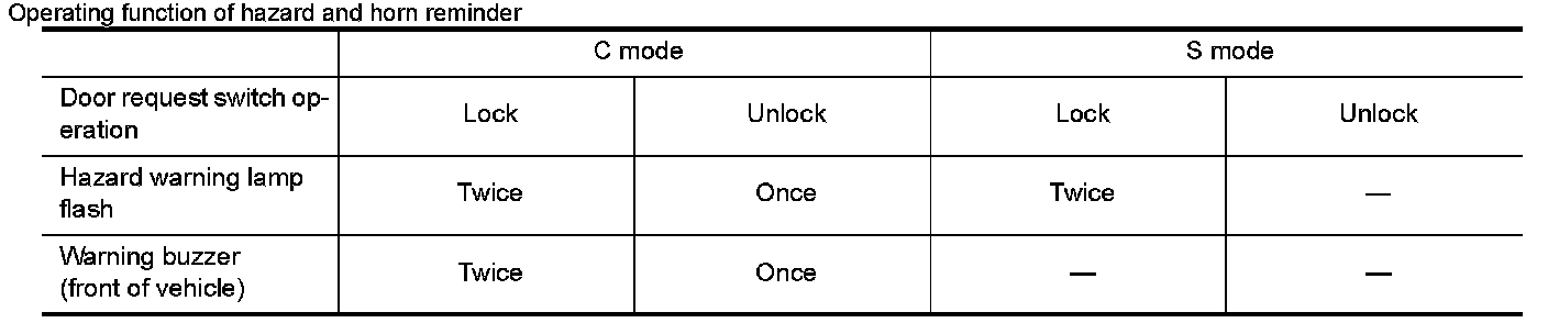 - When a door lock is locked or unlocked with request switch or remote control button operation, the hazard lamps flash and the Intelligent Key warning buzzer (front of vehicle) sounds (Hazard and horn reminder function).