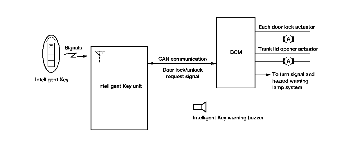 When doors are locked or unlocked by remote control of Intelligent Key, Intelligent Key unit sends hazard and horn request signal to BCM via CAN communication line.