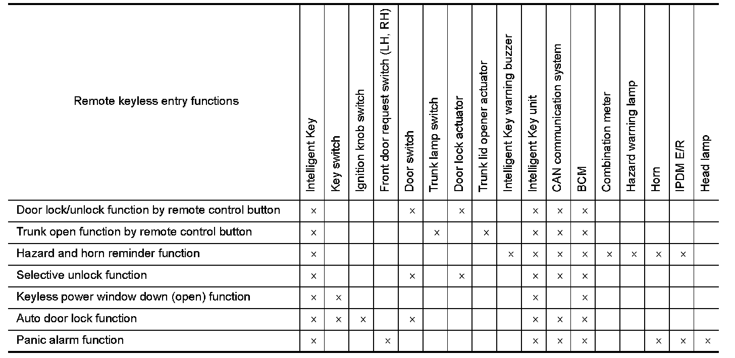 - Intelligent Key unit sends the door lock/unlock signal and sounds Intelligent Key warning buzzer (front of vehicle) warning (lock: 2 times, unlock: 1 time, trunk open: 4 times) at the same time.