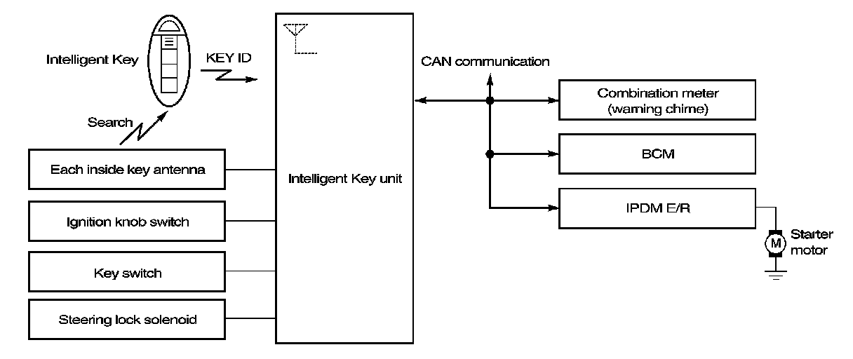 When ignition knob switch is ON (press ignition switch), Intelligent Key unit searches Intelligent Key in the vehicle using inside key antenna.