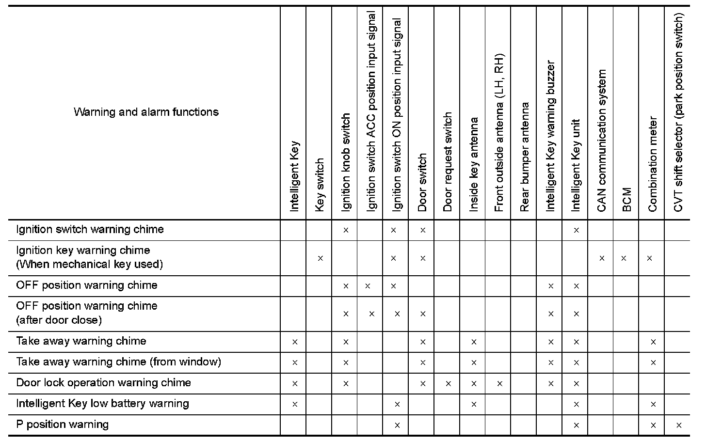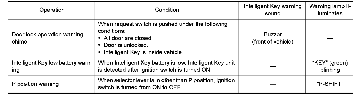 The following warning chime (combination meter), Intelligent Key warning buzzer (front of vehicle), and warning lamps "KEY" and "P-SHIFT" (combination meter) are given to the user as warning information while using the Intelligent Key system.