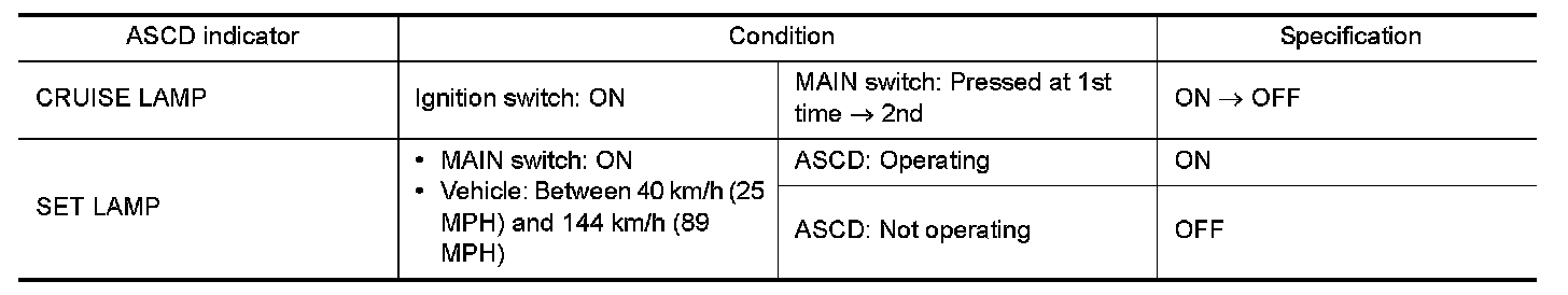 ASCD indicator lamp illuminates to indicate ASCD operation status. Lamp has two indicators, CRUISE and