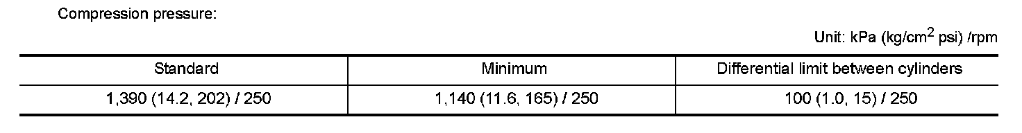 - If compression pressure is below minimum value, check valve clearances and parts associated with combustion chamber (Valve, valve seat, piston, piston ring, cylinder bore, cylinder head, cylinder head gasket). After the checking, measure the compression pressure again.