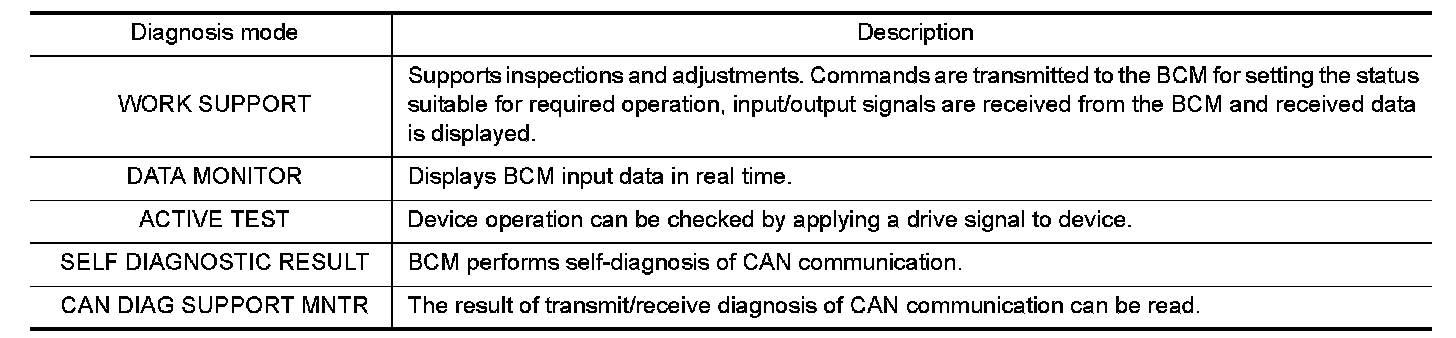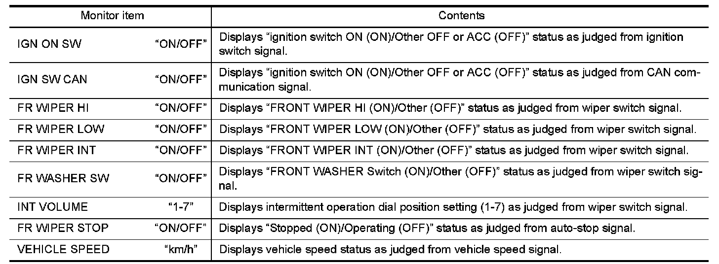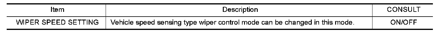 FRONT WIPER AND WASHER SYSTEMCONSULT Function (BCM) CONSULT can display each diagnostic item using the diagnostic test modes shown following.