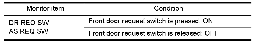 Check front door request switch ("DR REQ SW" or "AS REQ SW") in "DATA MONITOR" mode.