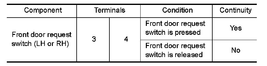 3.Check continuity between front door request switch terminals 3 and 4.