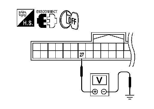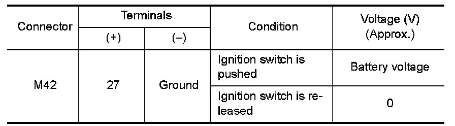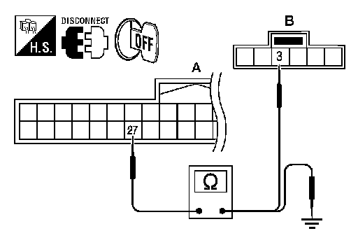 1.Check continuity between Intelligent Key unit harness connector M42 (A) terminal 27 and key switch and ignition knob switch harness connector M49 (B) terminal 3.