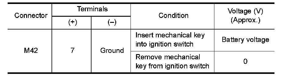 1.Check continuity between Intelligent Key unit harness connector M42 (A) terminal 7 and key switch and ignition knob switch harness connector M49 (B) terminal 1.