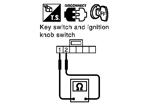 Check continuity between key switch and ignition knob switch terminals 1 and 2.