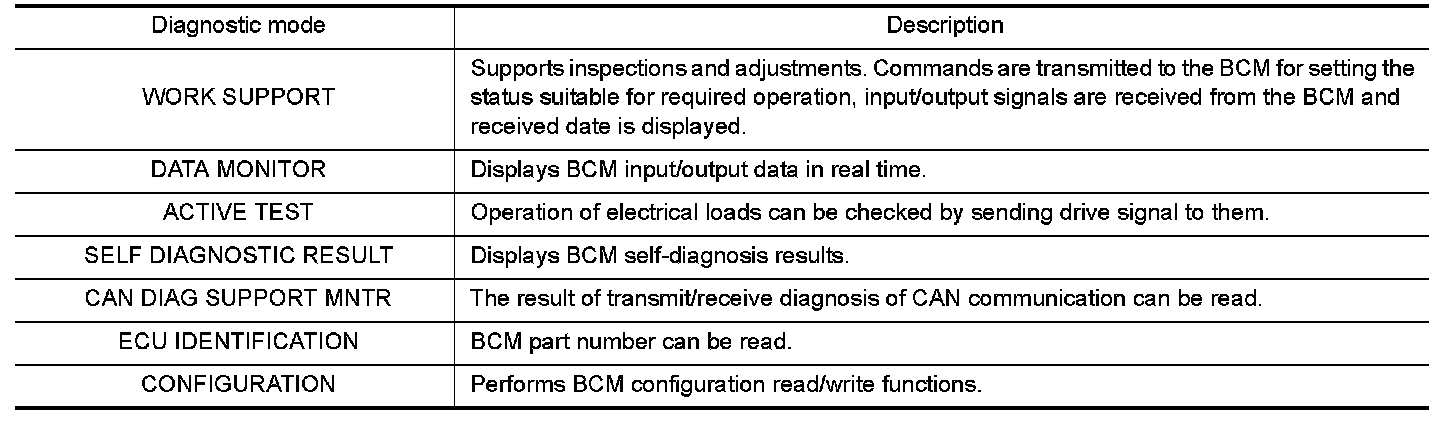 CONSULT can display each diagnostic item using the diagnostic test modes shown following.