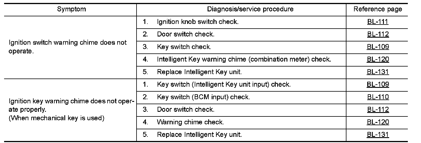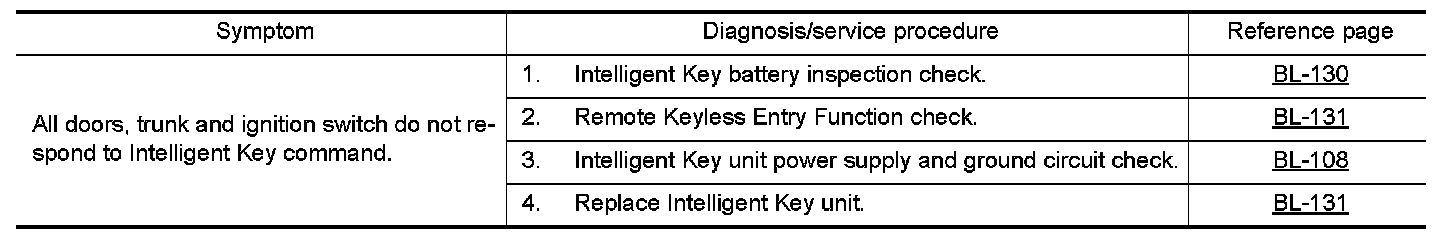 - If the following "symptoms" are detected, check systems shown in the "Diagnosis/service procedure" column in this order.
