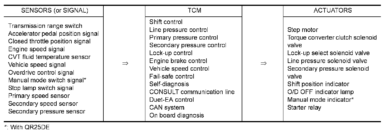 The CVT senses vehicle operating conditions through various sensors. It always controls the optimum shift position and reduces shifting and lock-up shocks.