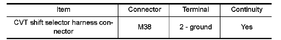 Check continuity between CVT shift selector harness connector terminal and ground.