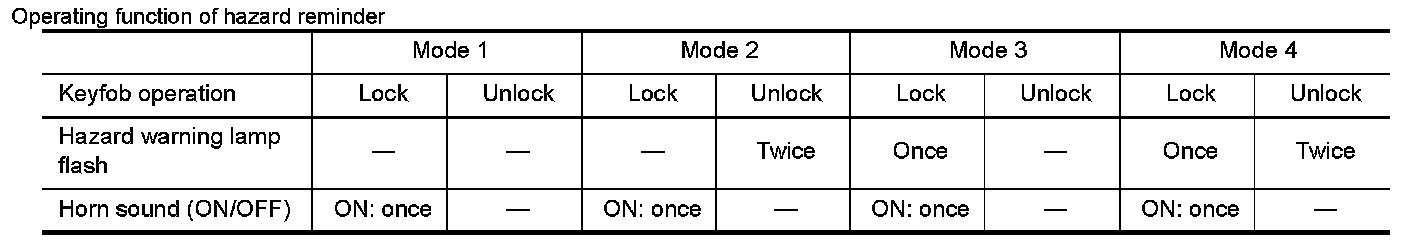 The hazard reminder has modes 1, 2, 3 or 4. The horn reminder can be turned ON/OFF with any LOCK mode.