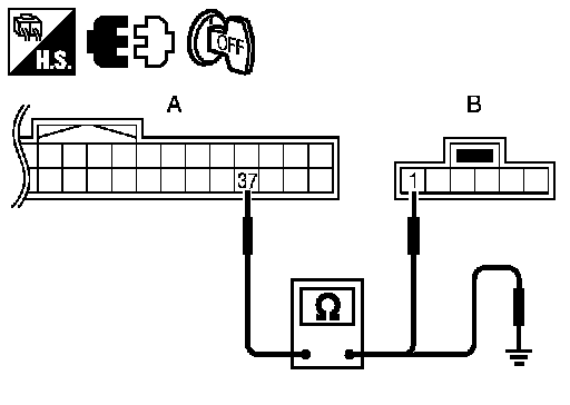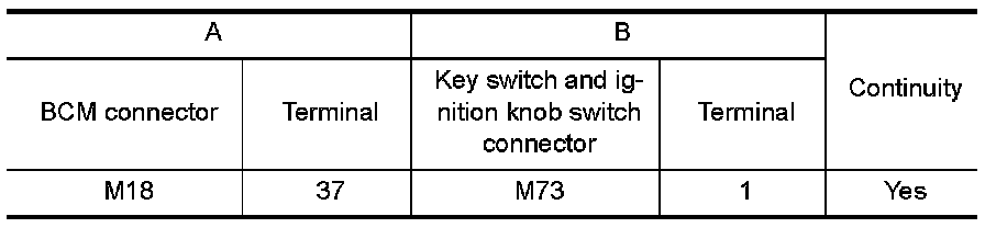 2.Check continuity between BCM connector (A) M18 terminal 37 and key switch and ignition knob switch connector (B) terminal 1.