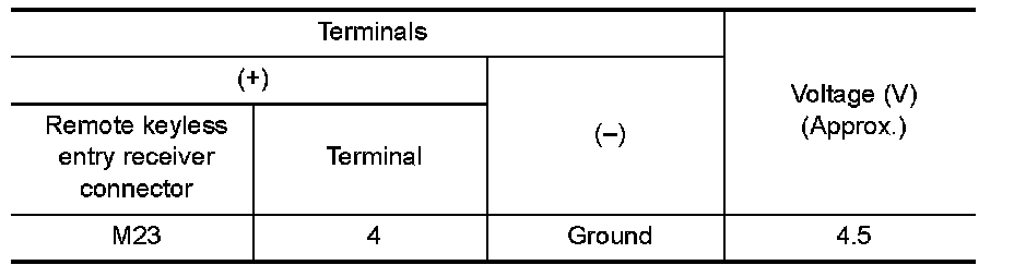 2.Check voltage between remote keyless entry receiver connector M23 terminal 4 and ground.