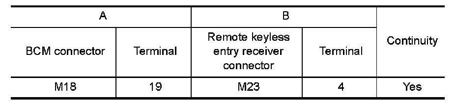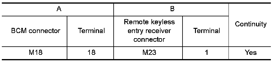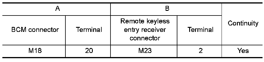 1.Check continuity between BCM connector (A) M18 terminal 20 and remote keyless entry receiver connector (B) M23 terminal 2.