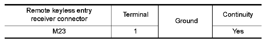 Check continuity between remote keyless entry receiver connector M23 terminal 1 and ground.