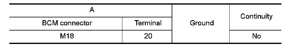 2.Check continuity between BCM connector (A) M18 terminal 20