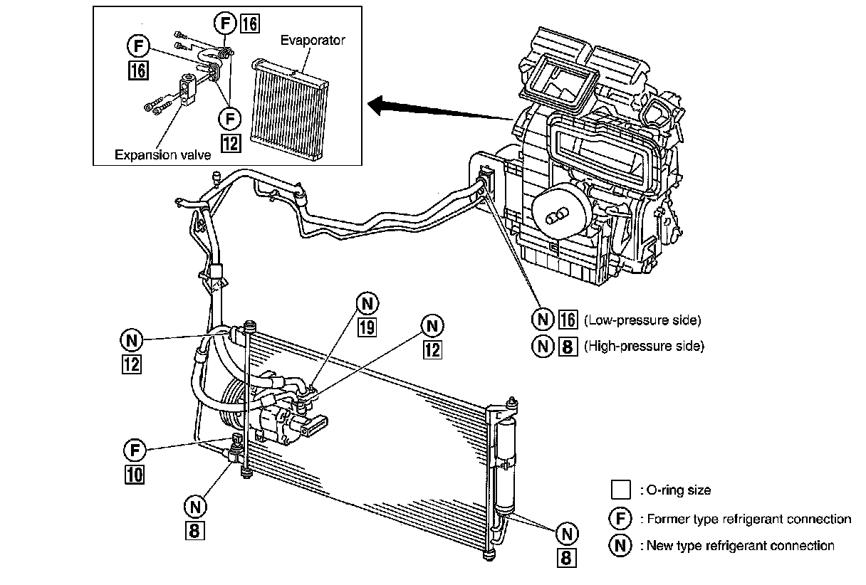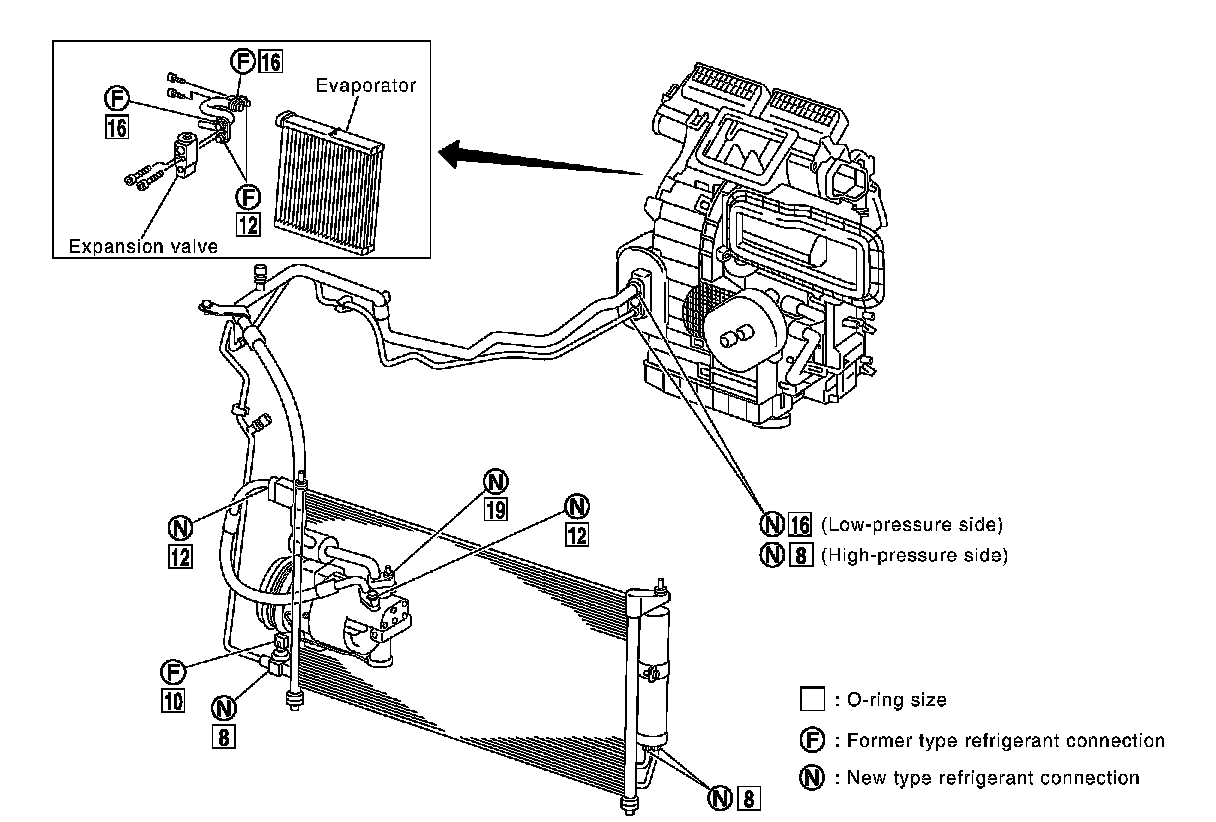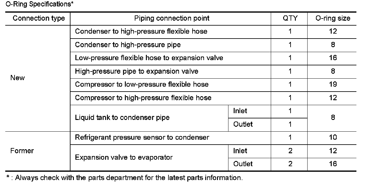 The new and former refrigerant connections use different O-ring configurations. Do not confuse Orings since they are not interchangeable. If a wrong O-ring is installed, refrigerant will leak at, or around, the connection.
