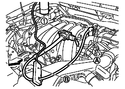 2.Connect No. 4 ignition coil (1) and No. 4 spark plug with suitable high-tension wire (A) as shown, and attach timing light clamp (B)