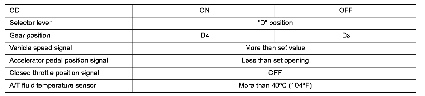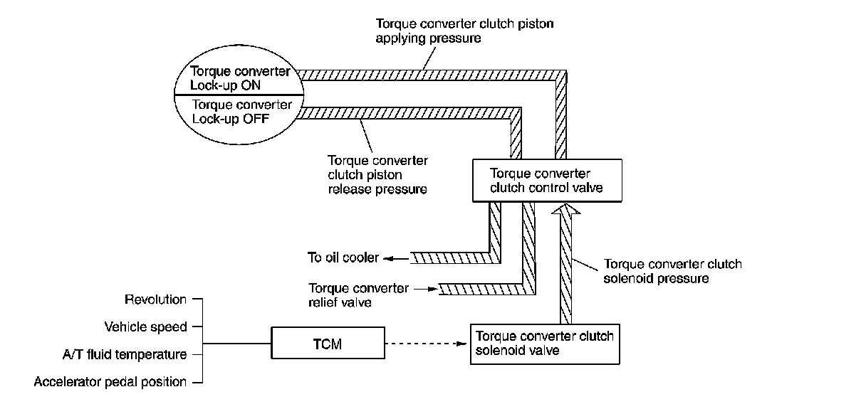 The torque converter clutch piston in the torque converter is locked to eliminate torque converter slip and to increase power transmission efficiency. The solenoid valve is controlled by an ON-OFF duty signal sent from the TCM. The signal is converted to an oil pressure signal which controls the torque converter clutch piston.