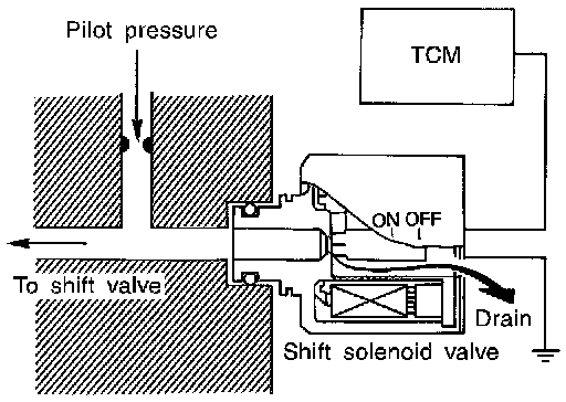 The shift solenoid valve performs simple ON-OFF operation. When set to "ON", the drain circuit closes and pilot pressure is applied to the shift valve.