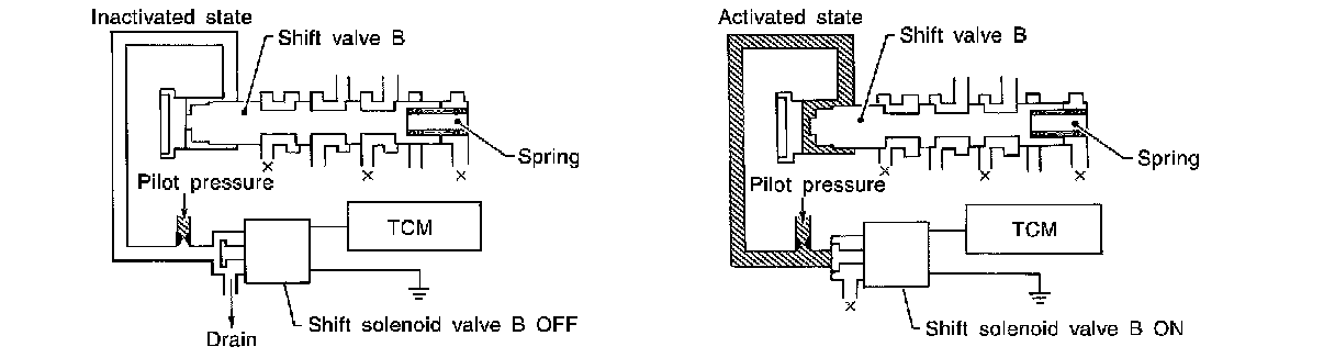 The figure above shows the operation of shift valve B. When the shift solenoid valve is "ON", pilot pressure applied to the end face of the shift valve overcomes spring force, moving the valve upward.