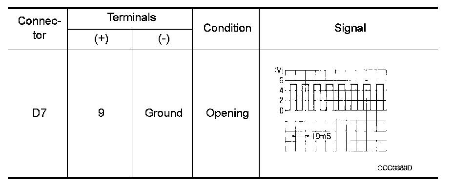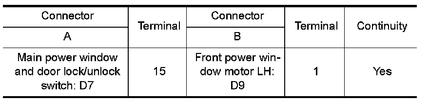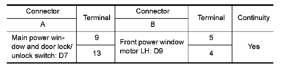 2.Check continuity between front power window motor LH connector D9 terminal 6 and main power window and door lock/unlock switch connector D7 terminal 2.