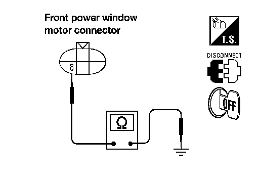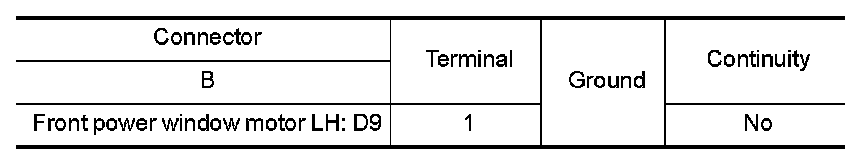 2.Check continuity between front power window motor LH connector D9 terminal 6 and ground.