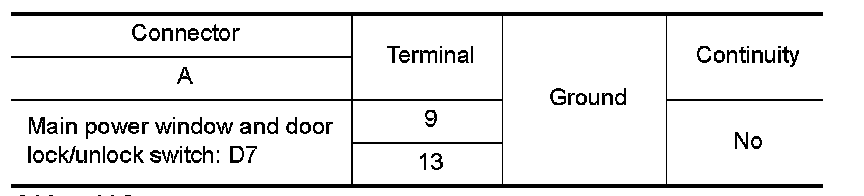4.Check continuity between main power window and door lock/unlock switch connector (A) and ground.