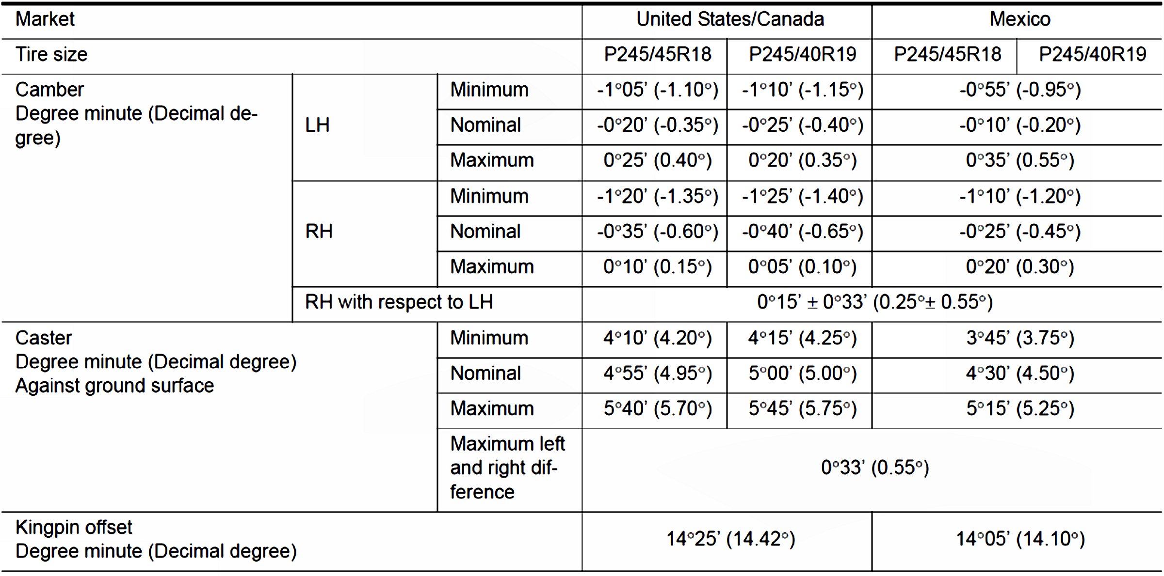 Front Camber, Caster and Kingpin Offset: