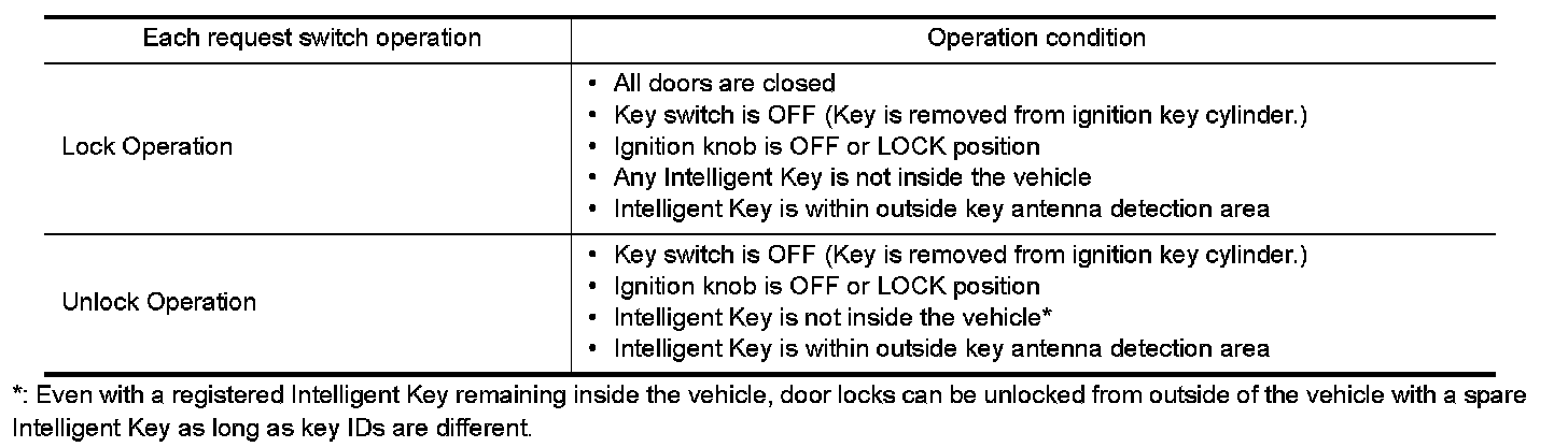 When all doors are locked, ignition switch is in OFF position and key switch is OFF (Intelligent Key is not inserted in key slot). Doors are unlocked with door request switch.