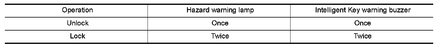During lock, unlock, operation by each request switch, the hazard warning lamps and Intelligent Key warning buzzer will blink or sound as a reminder.