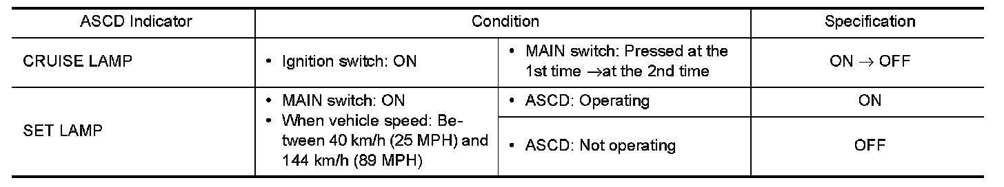 ASCD indicator lamp illuminates to indicate ASCD operation status. Lamp has two indicators, CRUISE and