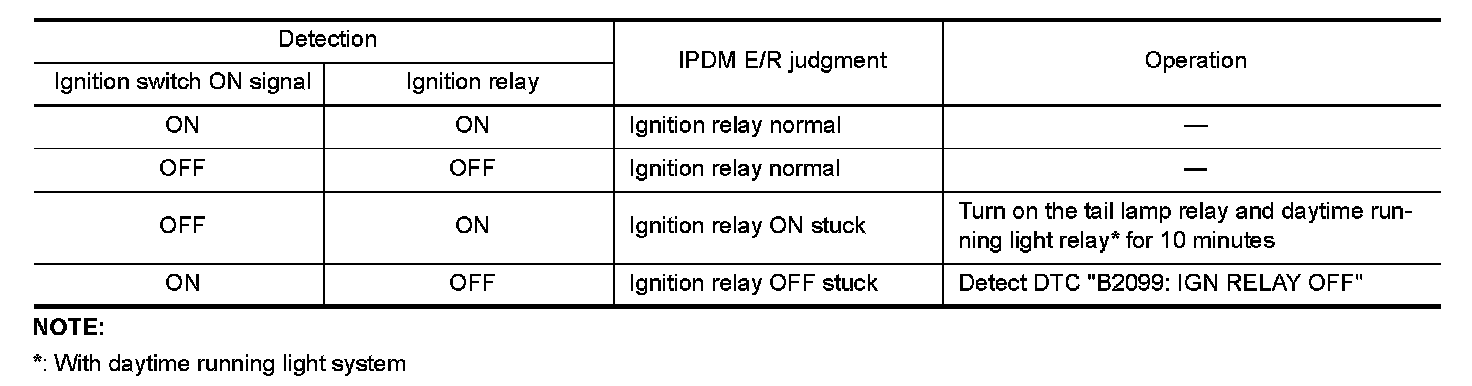 - IPDM E/R judges that the ignition relay is error, if status of the ignition relay and ignition switch ON signal (CAN).